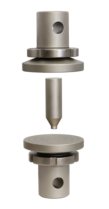 TH23-96 + THS791-50x50x155 Barrel expansion test fixture Incl. 2 steel compression platens, 96 mm Ø, 1 removing tool with 3 holes 26.5 mm, 31.5 mm, 36,5 mm Ø, 3 shapes 26 mm, 31 mm, 36 mm Ø Steel, nickel-plated Coupling Am50 Max. load 100 kN TH23-96 + THS791-60-D26 Barrel expansion test fixture 26 mm Ø insert |
