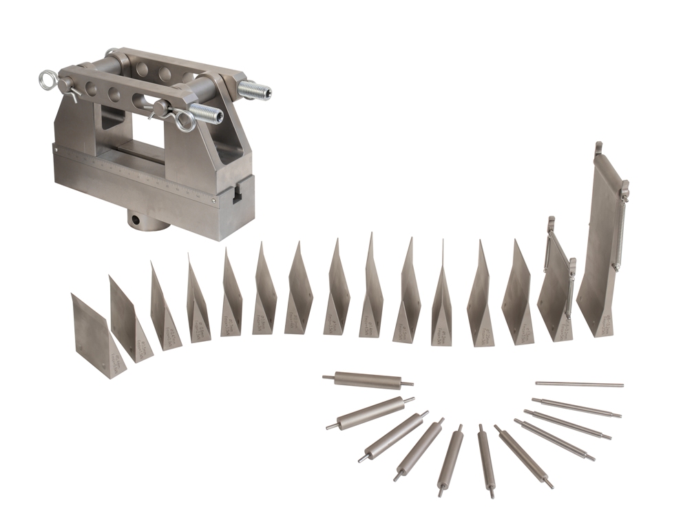 thermoplastics plates and tubes according to DIN-DVS2203-5 Roller diameter 50 mm Punch radius 12.5 mm Beam length 360 mm, 2 side bars Max. load 100 kN Coupling Af20 Steel, nickel-plated |