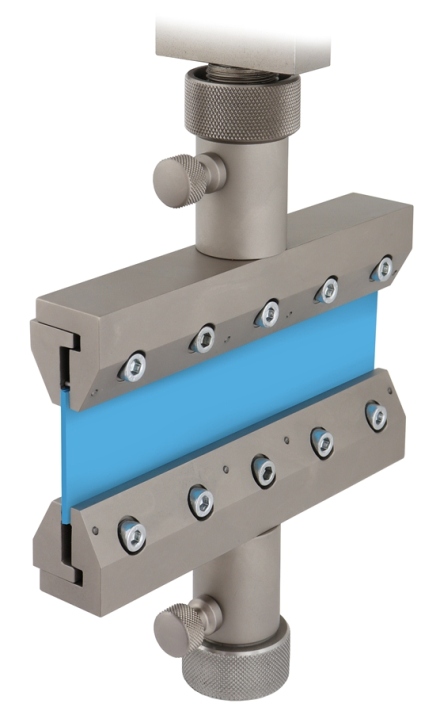 THS341-135-F-H45-Am1665 T-peel test fixture for foils Max. load 2 kN Coupling Am16 Lower sample holder 200x350 mm With 2 pyramid (serrated) jaws, clamping surface 140x30 mm The jaws are moveable Upper grip: clamping surface 135x10 mm (LxH) Opening 0 - 6 mm |