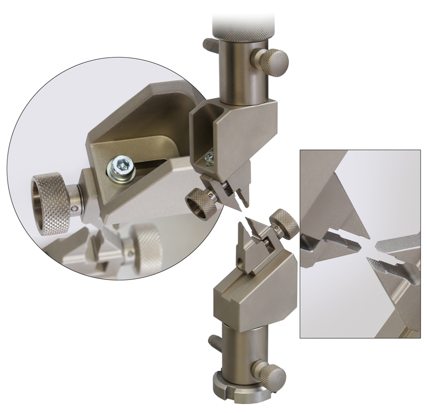 THS341-2x4-AW30-Af159 Special pincer grip for tiny samples Test angle 30° Pyramid (serrated) jaws with clamping surface 2x4 mm (W x H) Jaw opening 0-3 mm Grips can be slid left-right by 13 mm Steel hardened, nickel-plated |