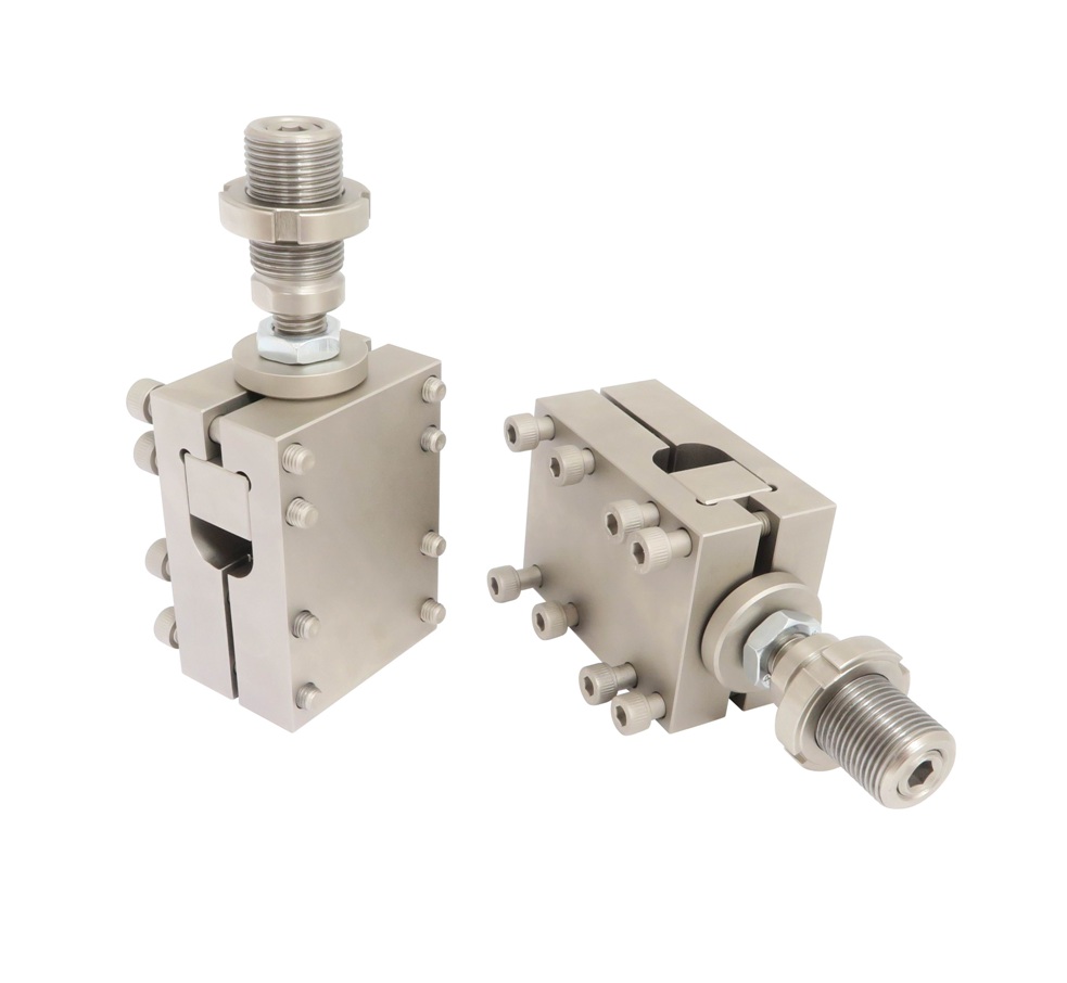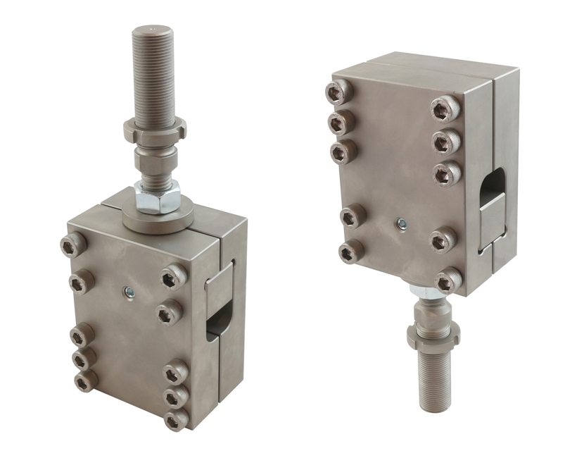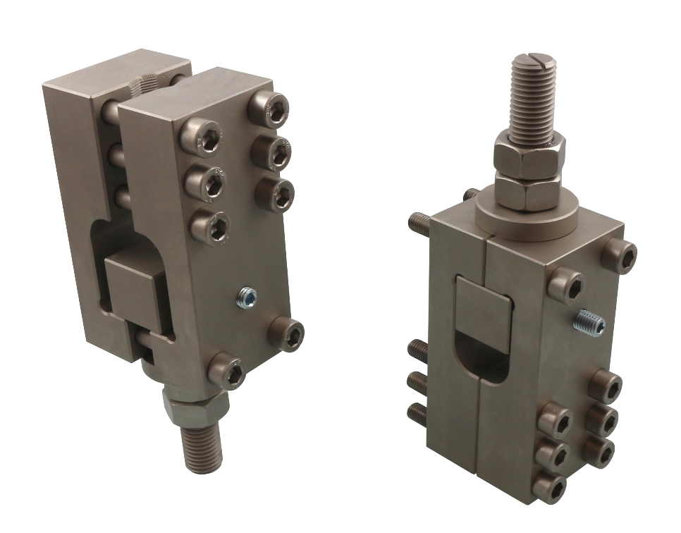 THS28-60-BP100-S10-F100-AM30 Special fatigue test grips Temperature range: -40 … +250°C Max. load 100 kN Incl. pyramid (serrated) jaws Clamping surface height x width: 60x100 mm Jaw opening 0-10 mm, coupling M30 |