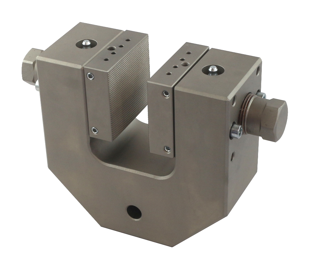 Special version For samples 0 - 100 mm thick Pyramid (serrated) jaws 60x100 mm (WxL) With plates to stabilize the jaws Max. clamping force 150 kN at 500 Nm torque Steel, nickel-plated Max. temperature +180°C Coupling Af318 |