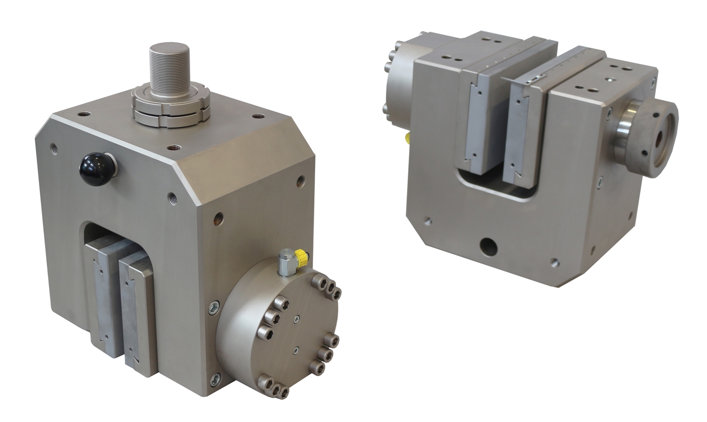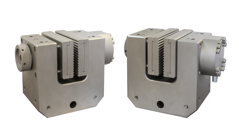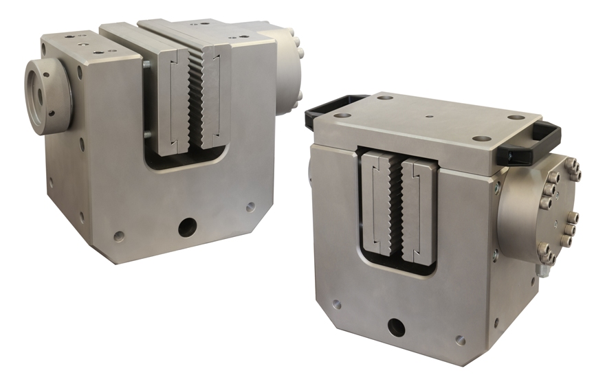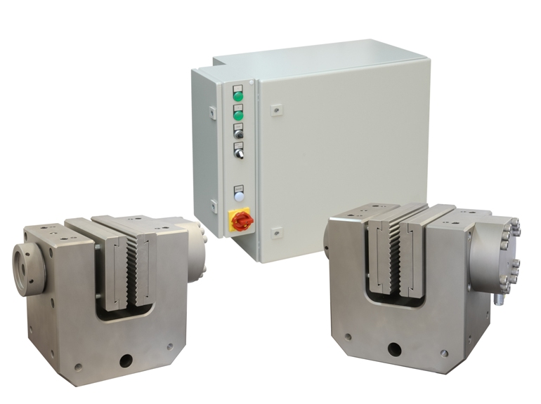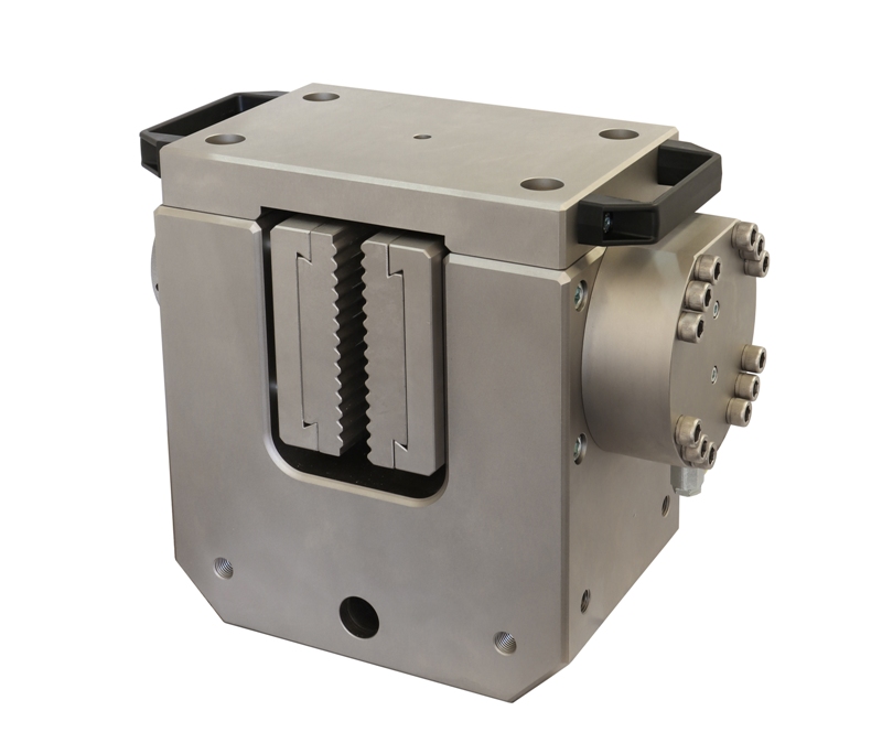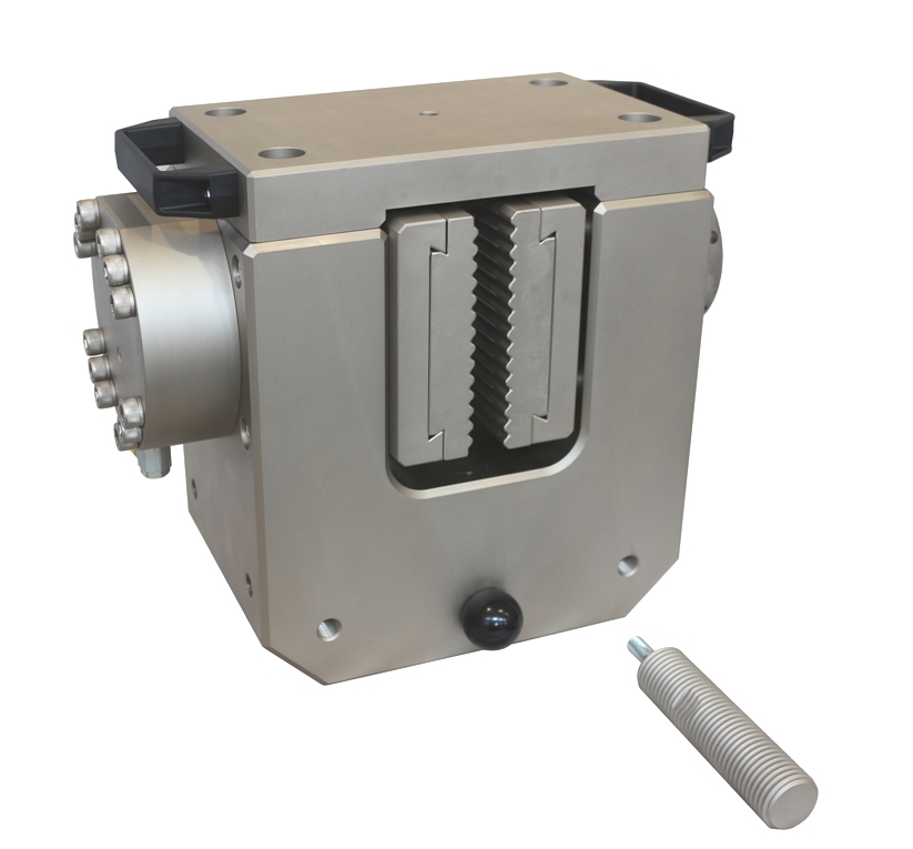 THS804-V22+EBW220x150 Special hydraulic grip for testing geotextiles with 1 piston Max. tensile load: 250 kN Wave insert jaws with clamping surface 220x150 mm (L x H) Jaw opening 0-30 mm |
