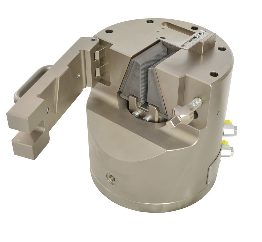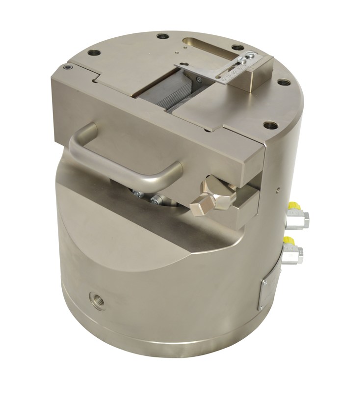 THS681 Hydraulic wedge grip with a sample centering device Max. tensile force: 250 kN Max. clamping force: 600 kN at 100 bar Steel, nickel-plated