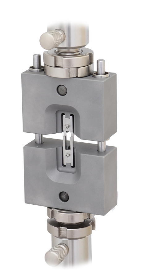 Customized grip for tensile tests on very small samples, with guides for high precision.