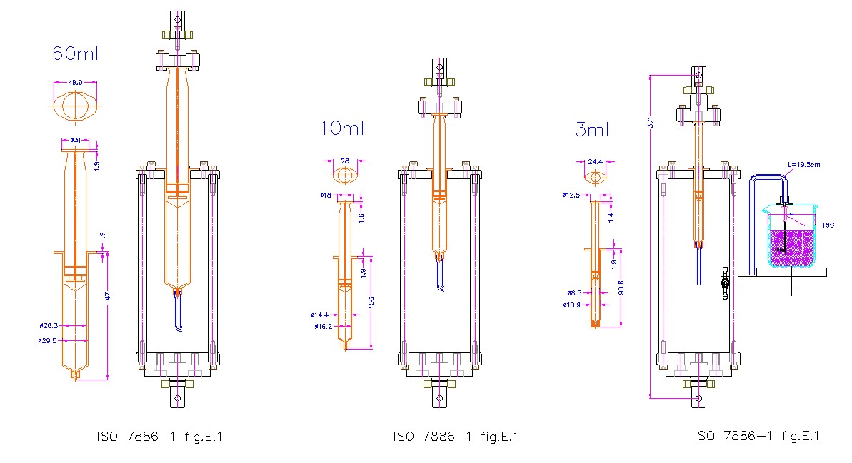 syringes, for manual use ) according to DIN EN ISO7886-1-Fig.E1 for compression and tensile tests to measure the load necessary to push fluid through