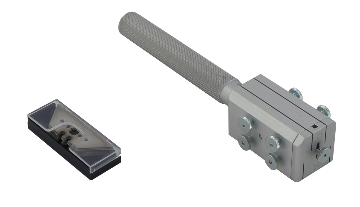 THS1232 Manual dual blade sample cutter,applicable for preparing specimens according to ASTM-F88 and ASTM-D882, similar to ASTM-D6287 THS1232 Datasheet.pdf THS1232 Datenblatt.pdf Animation