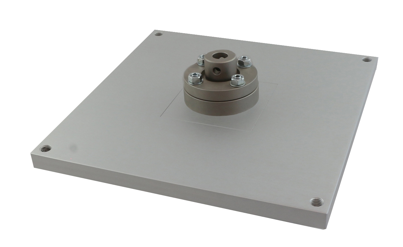 TH36-300-QZ100-Al + THS223k-79.8R0.5-Af159 Special rectangular compression platen Dimensions: 300x300 mm With square centering grave 100x100 mm Aluminium, anodized Upper spherically-seated compression platen Ø79.8 mm, corner