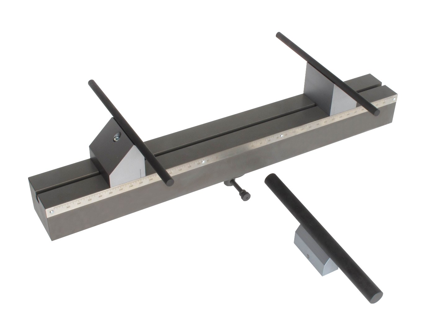 3-point bending fixture according to EN310 Max. load 100 kN Incl. 1x lower bar 800 mm long 2x supports with roller 15 mm x 350 mm 1x 3 point nose with roller 30 mm x 350 mm, aluminium