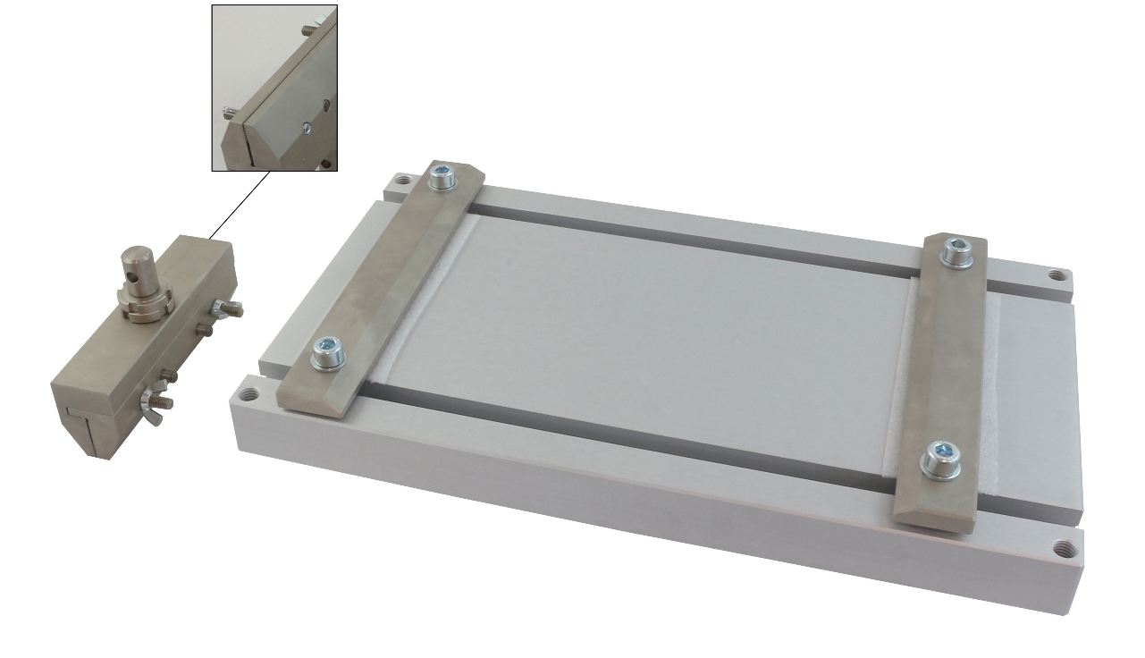 THS341-135-F-H45-Am1665 T-peel test fixture for foils Max. load 2 kN Coupling Am16 Lower sample holder 200x350 mm With 2 pyramid (serrated) jaws, clamping surface 140x30 mm The jaws are moveable Upper grip: clamping surface 135x10 mm (LxH) Opening 0 - 6 mm |
