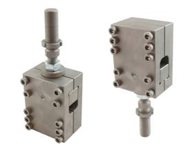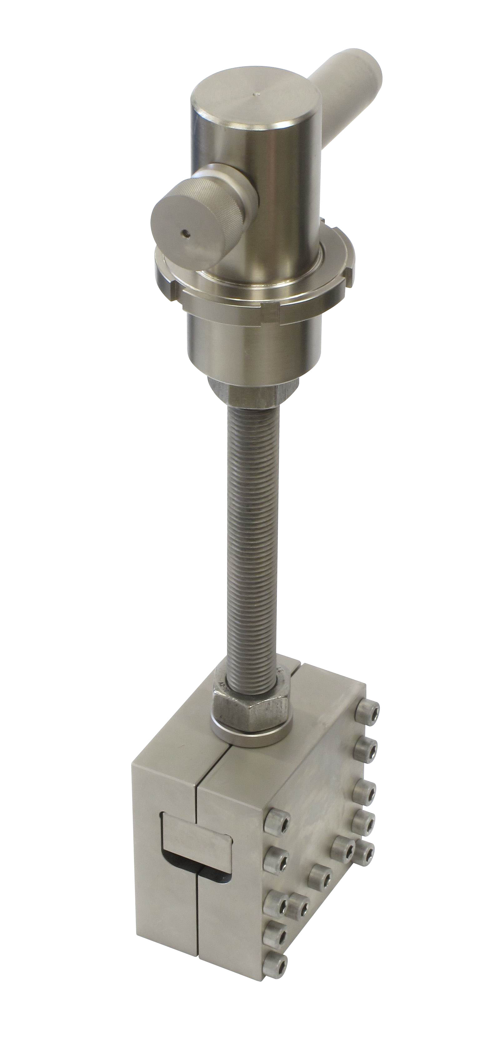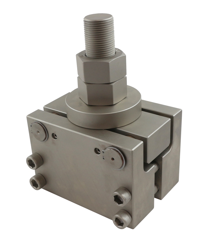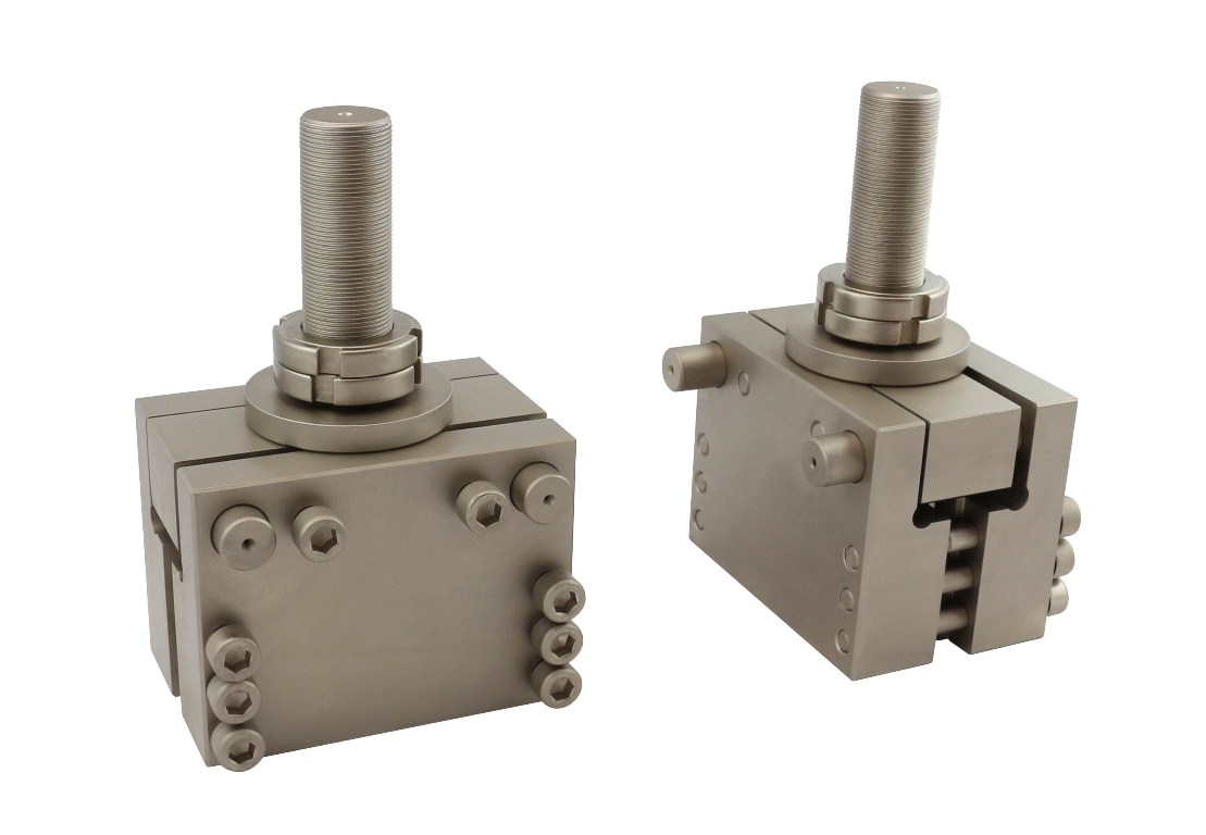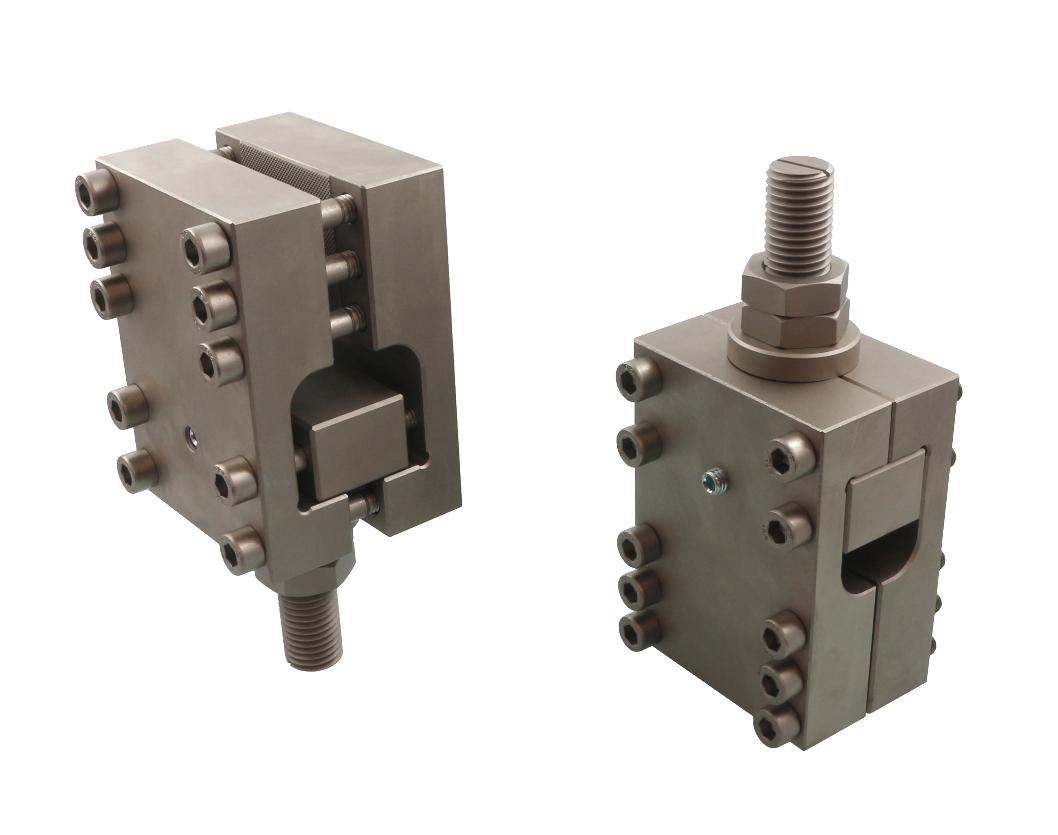 THS28-60-BP100-S10-F100-AM30 Special fatigue test grips Temperature range: -40 … +250°C Max. load 100 kN Incl. pyramid (serrated) jaws Clamping surface height x width: 60x100 mm Jaw opening 0-10 mm, coupling M30 |