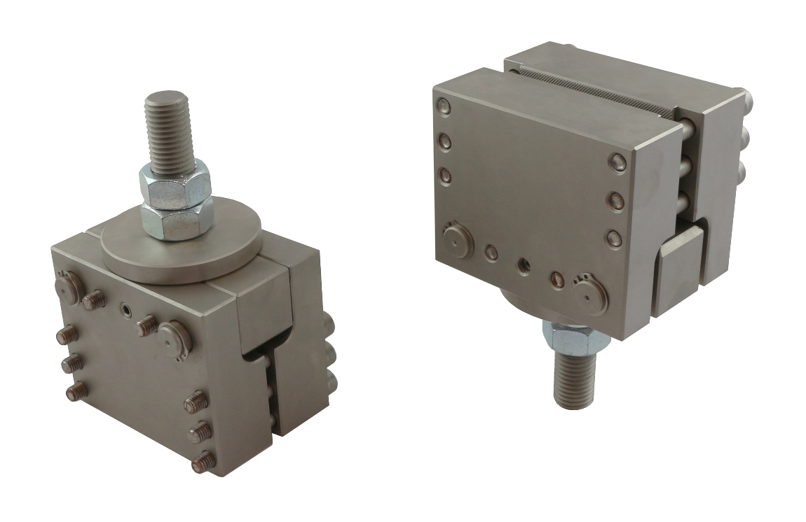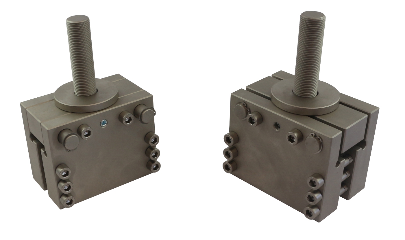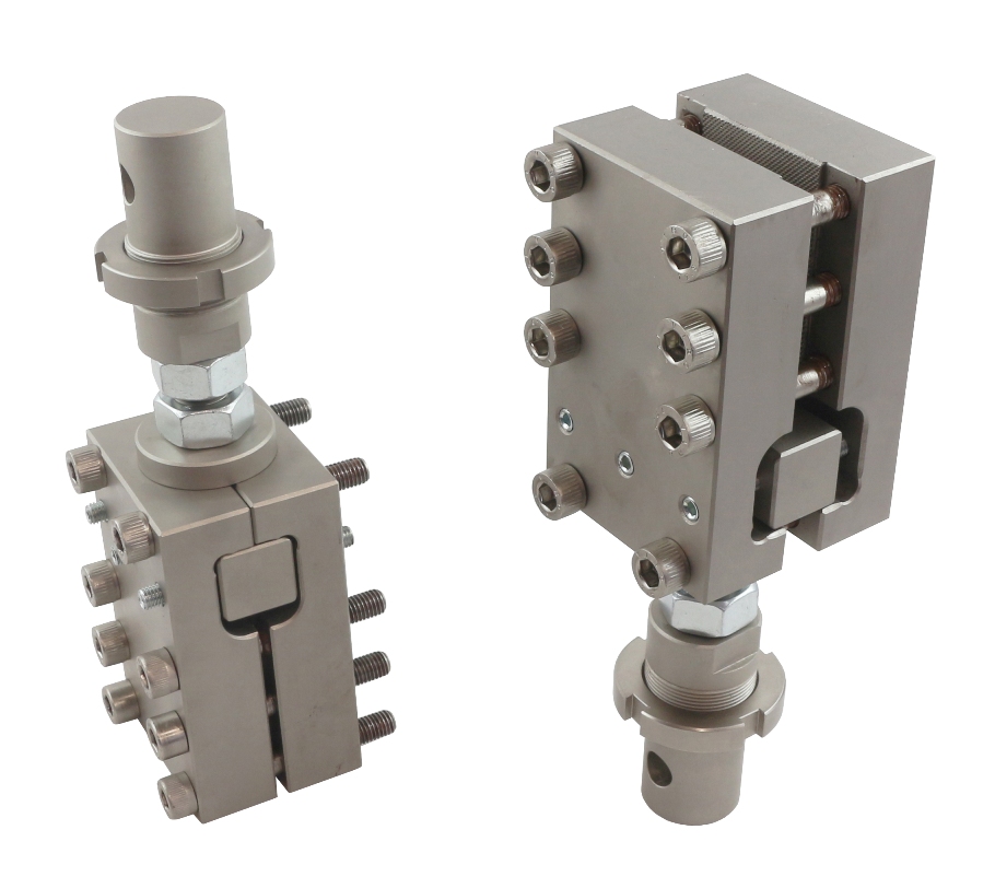 THS28-BP110x70-S15-AmM27x2 Special fatigue test grip Max. load 100 kN Pyramid (serrated) jaws, Clamping surface 110x70 mm Opening 5-15 mm Coupling AmM27x2 |