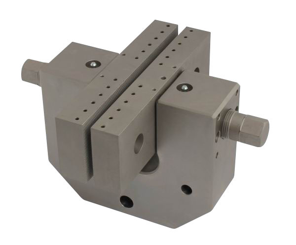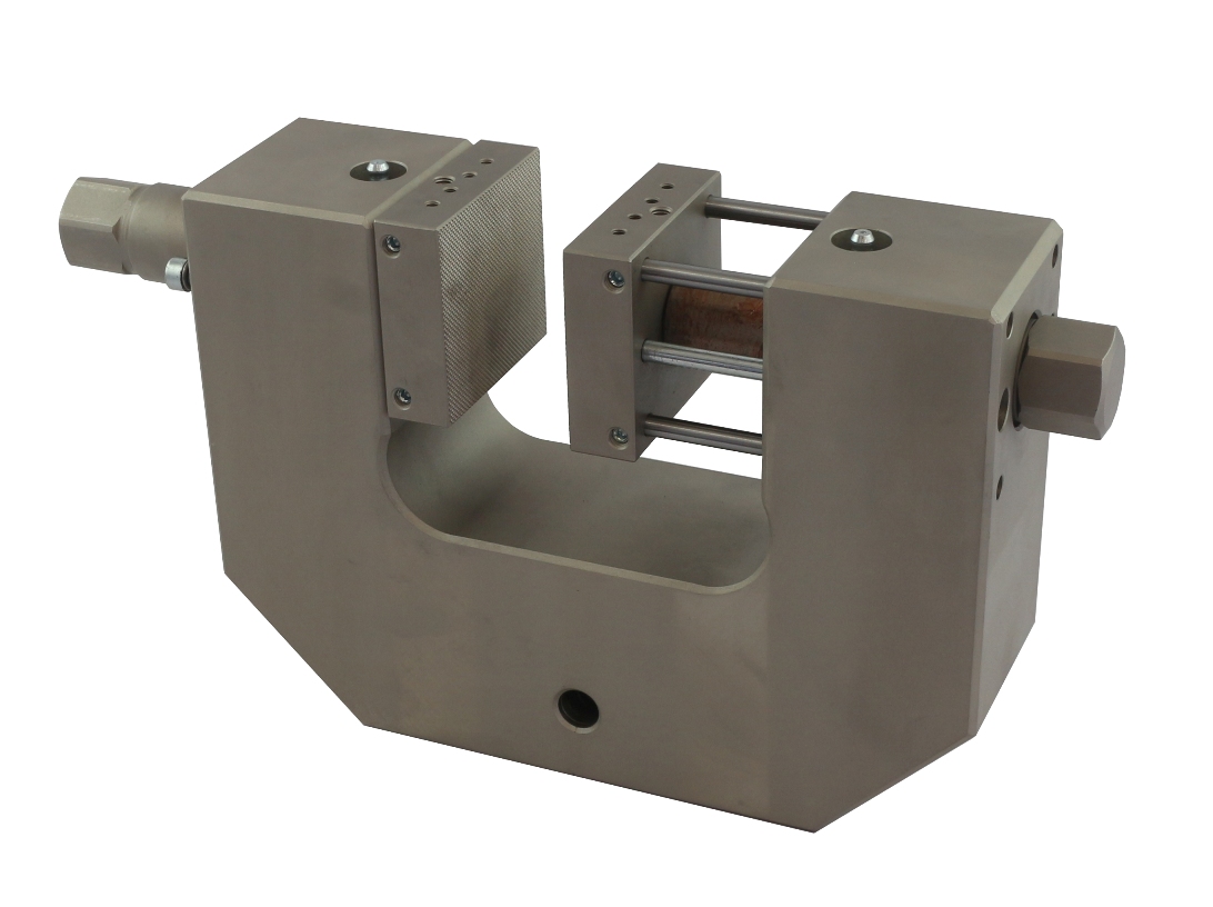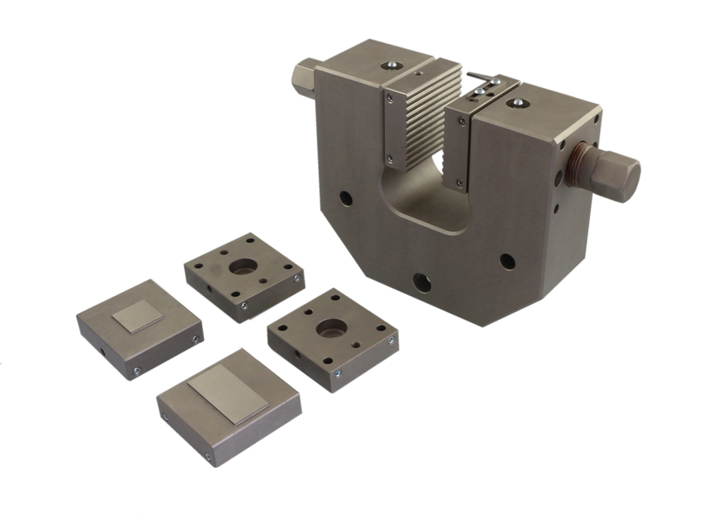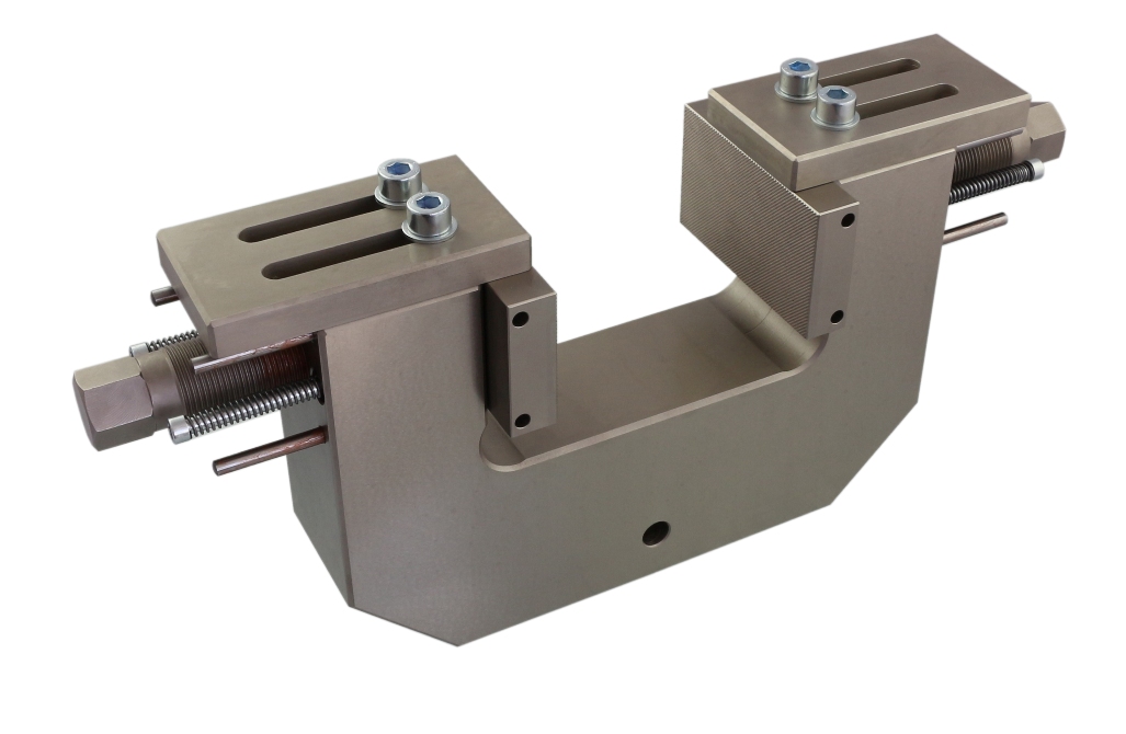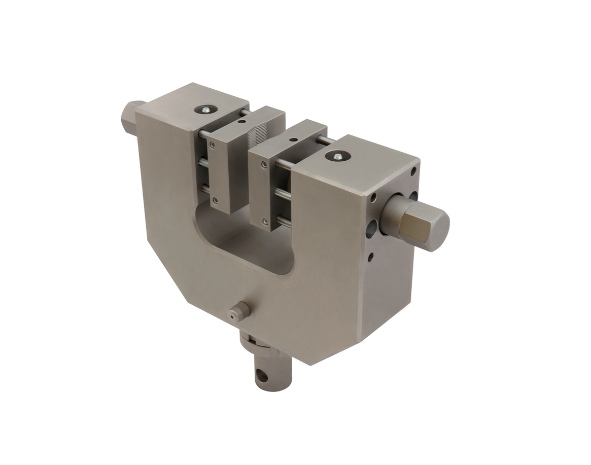 Special version For samples 0 - 100 mm thick Pyramid (serrated) jaws 60x100 mm (WxL) With plates to stabilize the jaws Max. clamping force 150 kN at 500 Nm torque Steel, nickel-plated Max. temperature +180°C Coupling Af318 |